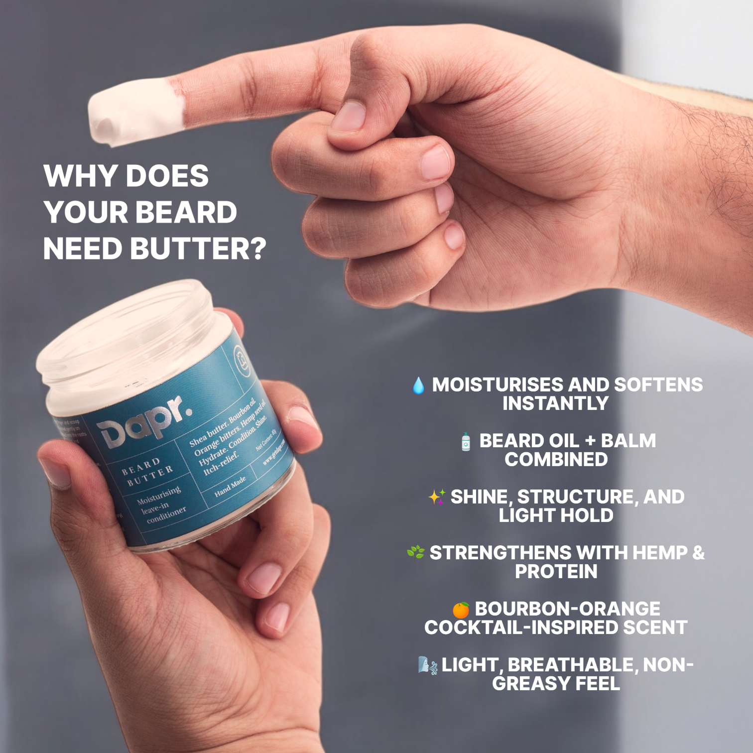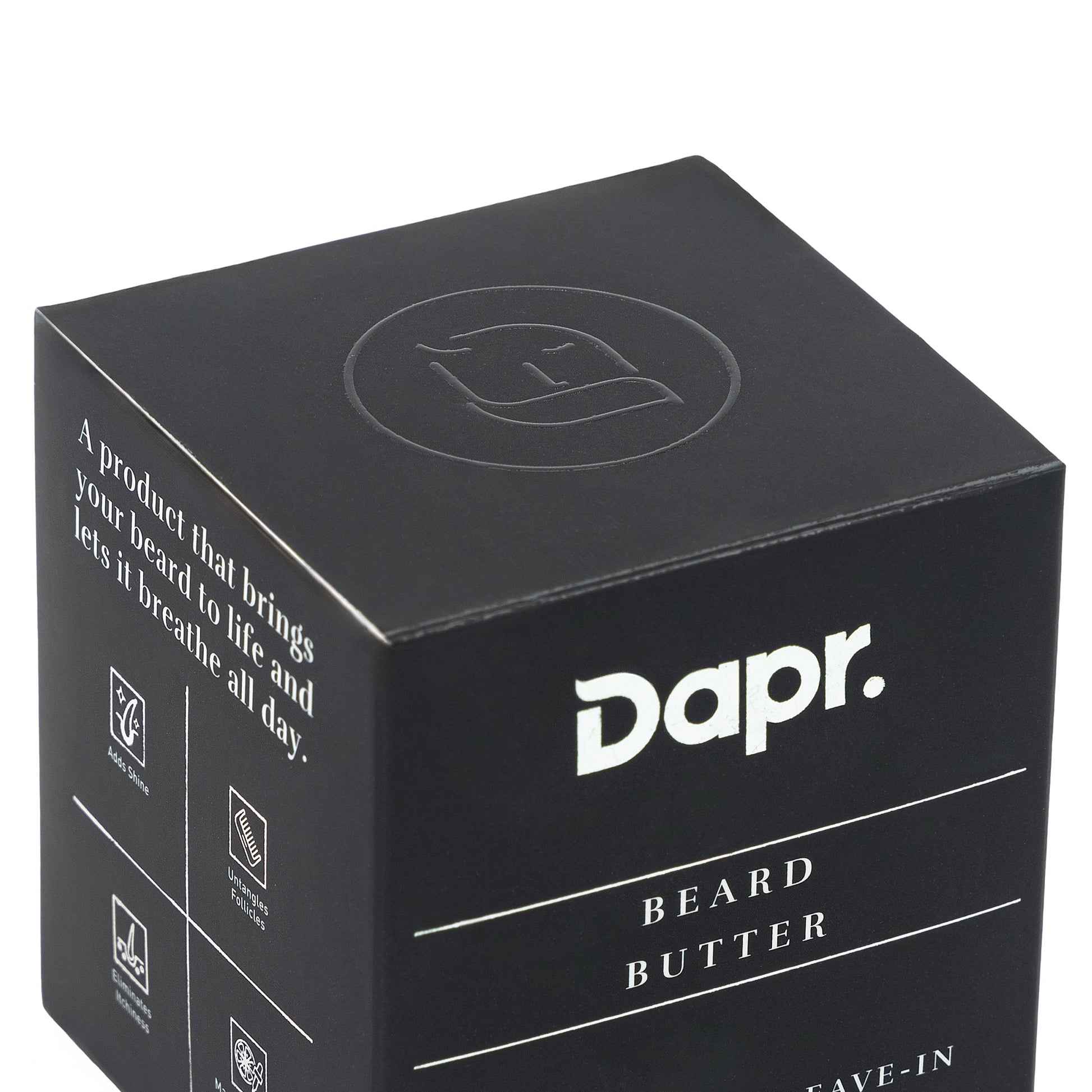 - The Dapr. Beard Butter contains wholesome organic ingredients: Shea Butter. Bourbon Oil. Orange Bitters. Hemp Seed Oil, Macadamia oil, Jojoba Oil, Coconut Oil, Rosemary Oil, Castor Oil, Wheat Protein.